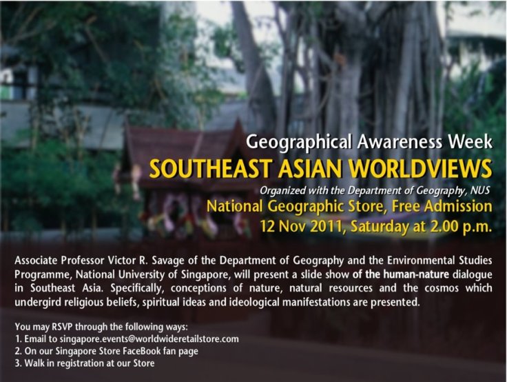 As part of Geography Awareness Week, Associate Professor Victor Savage from the NUS Department of Geography will be giving a public presentation on human-nature relationships in Southeast Asia. Some Geography students will also be displaying their posters.