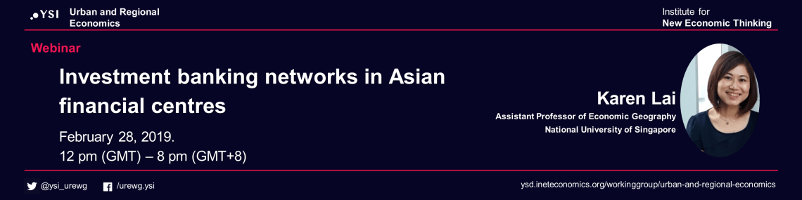 On 28 February 2019, I will be speaking at a webinar organised by the Young Scholars Initiative, Urban and Regional Economics Working Group (part of the Institute for New Economic Thinking). In the presentation, I will discuss how regulatory history and regional dynamics shape investment banks, financial networks and Asian financial centres. The findings are based on research funded by the Global Production Networks Centre (GPN@NUS) and have been written up in a forthcoming paper in Regional Studies journal (co-authored with Kurtulus Gemici).