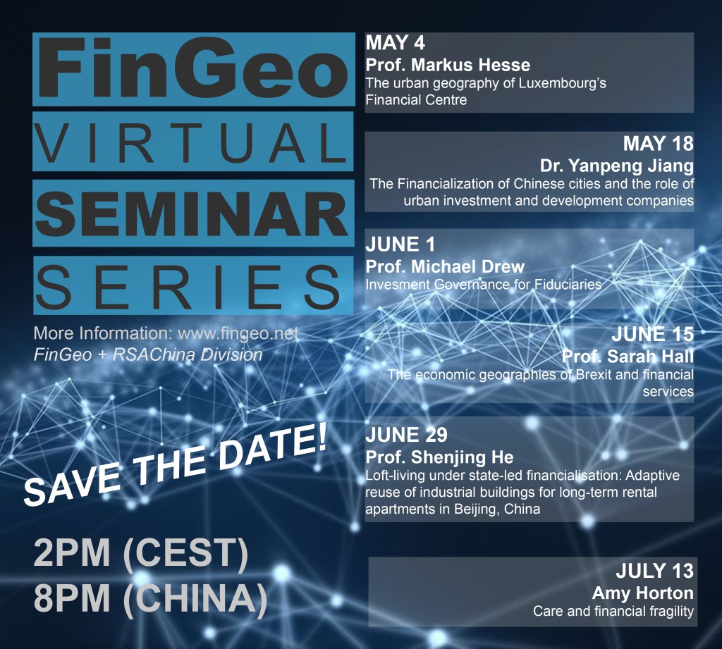 Part II of the FinGeo Virtual Seminar Series (May-July 2021) is co-organised by Fenghua Pan and Thomas Sigler, featuring speakers from diverse locations and specialisations. The next seminar will be given by Markus Hesse (University of Luxembourg) on 4th May 2021, 14.00 CEST/20.00 China (please click here for details and registration).