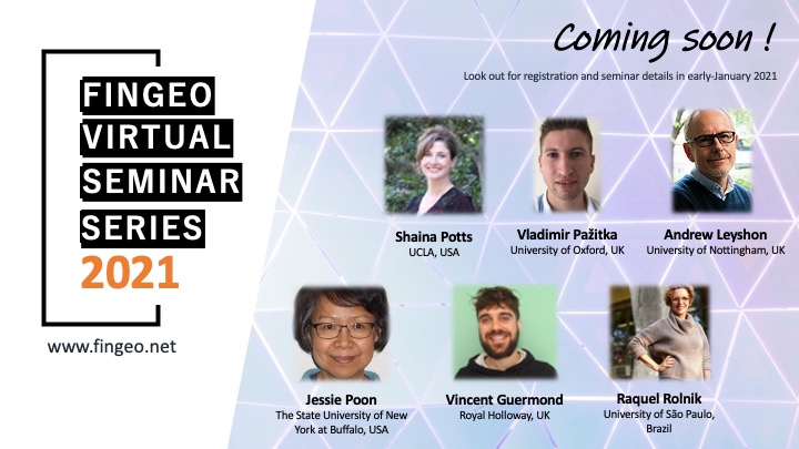 Given the uncertainty of holding in-person events in 2021, the FinGeo committee decided back in 2020 to organise a virtual seminar series to maintain community engagement and discussions. Organised in three parts (February-March, May-July, and September-November), we have finished with a very stimulating and well-attended Part 1, and about to start with Part 2 in May 2021. With thanks to Regional Studies Association (RSA) for their continued support.