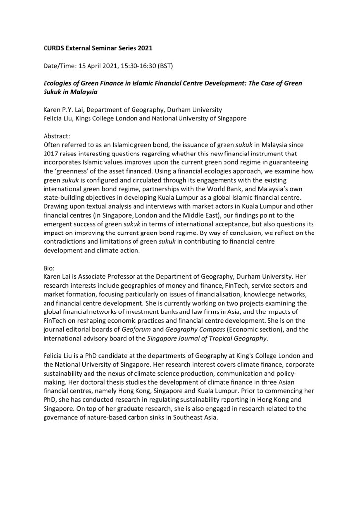 It’s been a rather busy April. Teaching and marking aside, I was able to give two seminars based on on-going work. The first was a seminar for the Centre for Urban and Regional Development (CURDS), Newcastle University, on 15th April 2021. Titled ‘Ecologies of Green Finance in Islamic Financial Centre Development: The Case of Green Sukuk in Malaysia’, this is co-authored with Felicia Liu (Kings College London and National University of Singapore) and combines from our interests in Islamic finance and green finance.