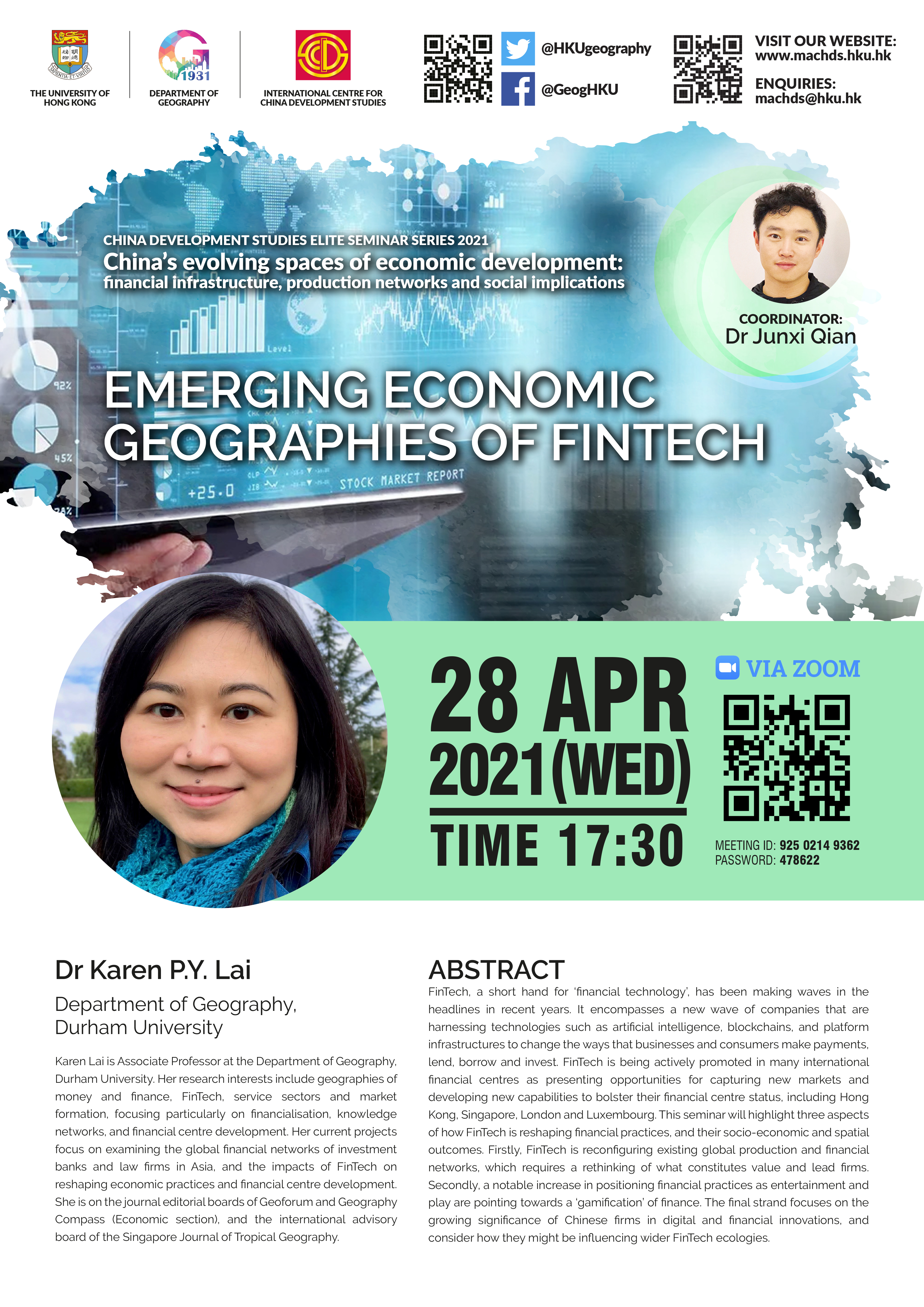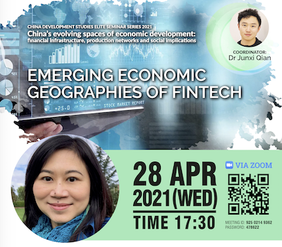 The other seminar happened earlier today (28th April 2021) with the the Department of Geography at University of Hong Kong, as part of their China Development Studies Elite Seminar Series. Titled ‘Emerging Economic Geographies of FinTech’, this seminar draws from some on-going research that I have been conducting on FinTech, and highlights particular observations that I hope will provoke further thinking and research on economic geographies of FinTech.